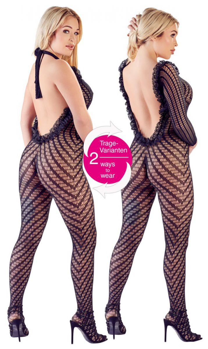Ολόσωμο καλσόν χωρίς ραφές από ελαστικό και απαλό διχτυωτό υλικό με ριγέ σχέδιο και δαντελένια βολάν. Πολύ χαμηλό κόψιμο στο πίσω μέρος, χωρίς καβάλο και με ενισχυμένο μέρος στα δάχτυλα. Εναλλακτικός τρόπος φορέματος: Τα μακριά μανίκια μπορούν να δεθούν μεταξύ τους πίσω από το λαιμό. Υλικό: 94% πολυαμίδιο, 6% spandex.