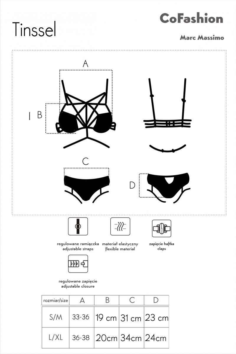 Σαγηνευτικό σετ από ελαστικό ημιδιαφανές τούλι και κεντητή δαντέλα με πεταλούδες. Ελαστικά στραπς στο σουτιέν και στο κιλοτάκι δημιουργούν μια δραματικότατη γεωμετρία που μαγνητίζει! Κρίκοι και κλεισίματα σε χρυσαφί χρώμα δίνουν μια διακριτική πινελιά πολυτέλειας. 90% νάυλον, 10% ελαστάνη.,