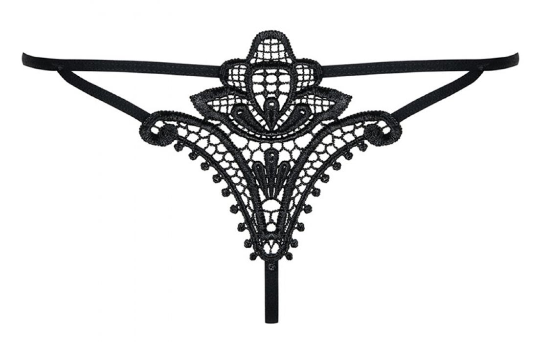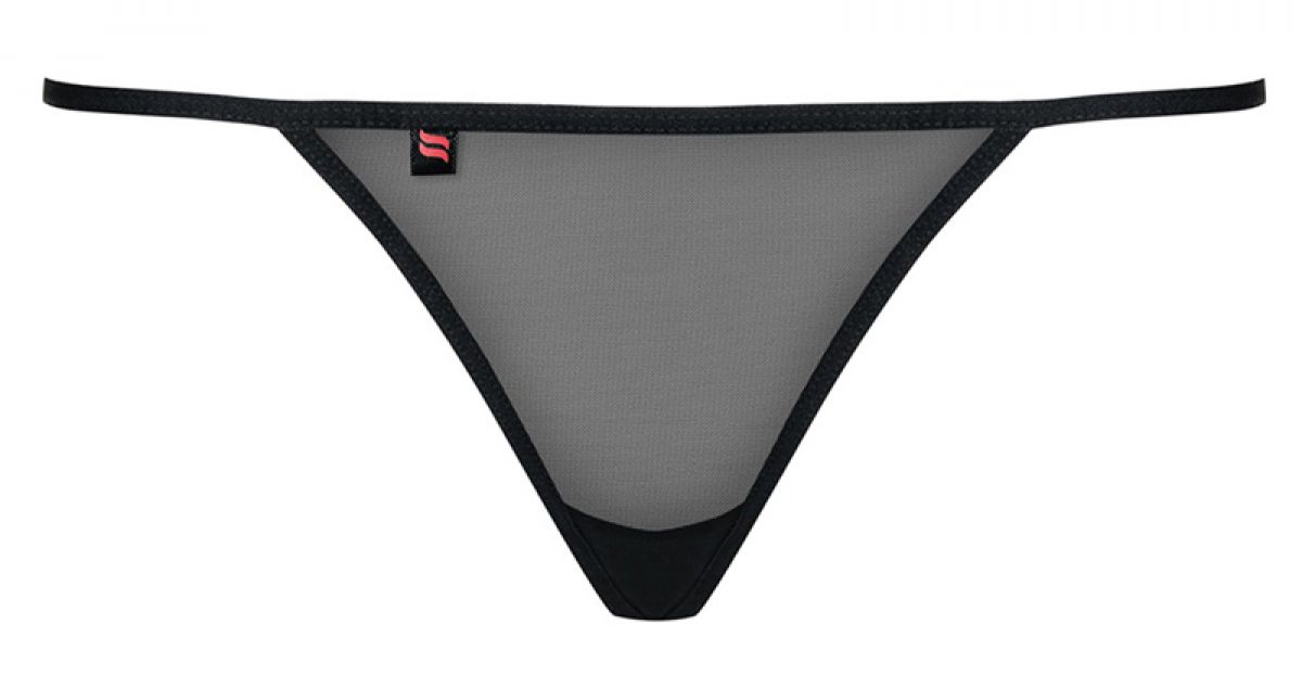 Μίνιμαλ μαύρο στρινγκ με διαφάνεια μπροστά και κεντητή δαντέλα στο πίσω μέρος. 94% νάυλον, 6% ελαστάνη