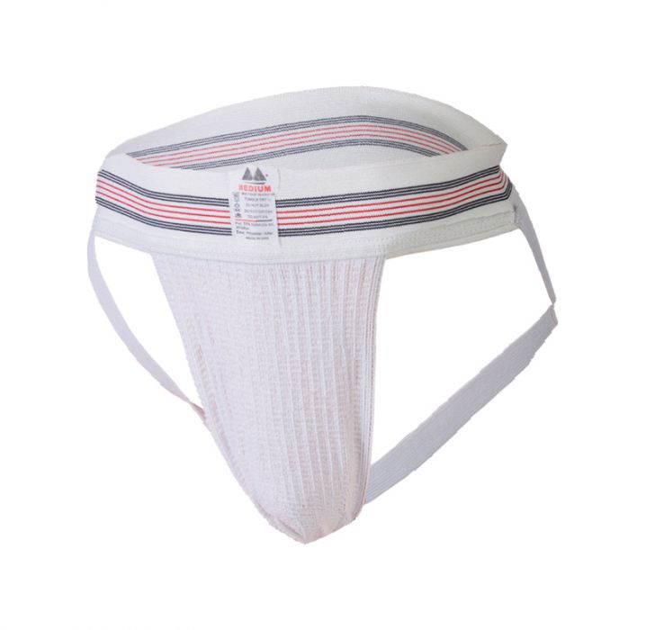 Λευκό jockstrapμε αναπνεόμενο διχτυωτό ύφασμα μπροστά. Ελαστικά στραπς και φαρδιά ζώνη 7,5 εκατοστών. 55% νάυλον, 25% ελαστάνη, 20% βαμβάκι.