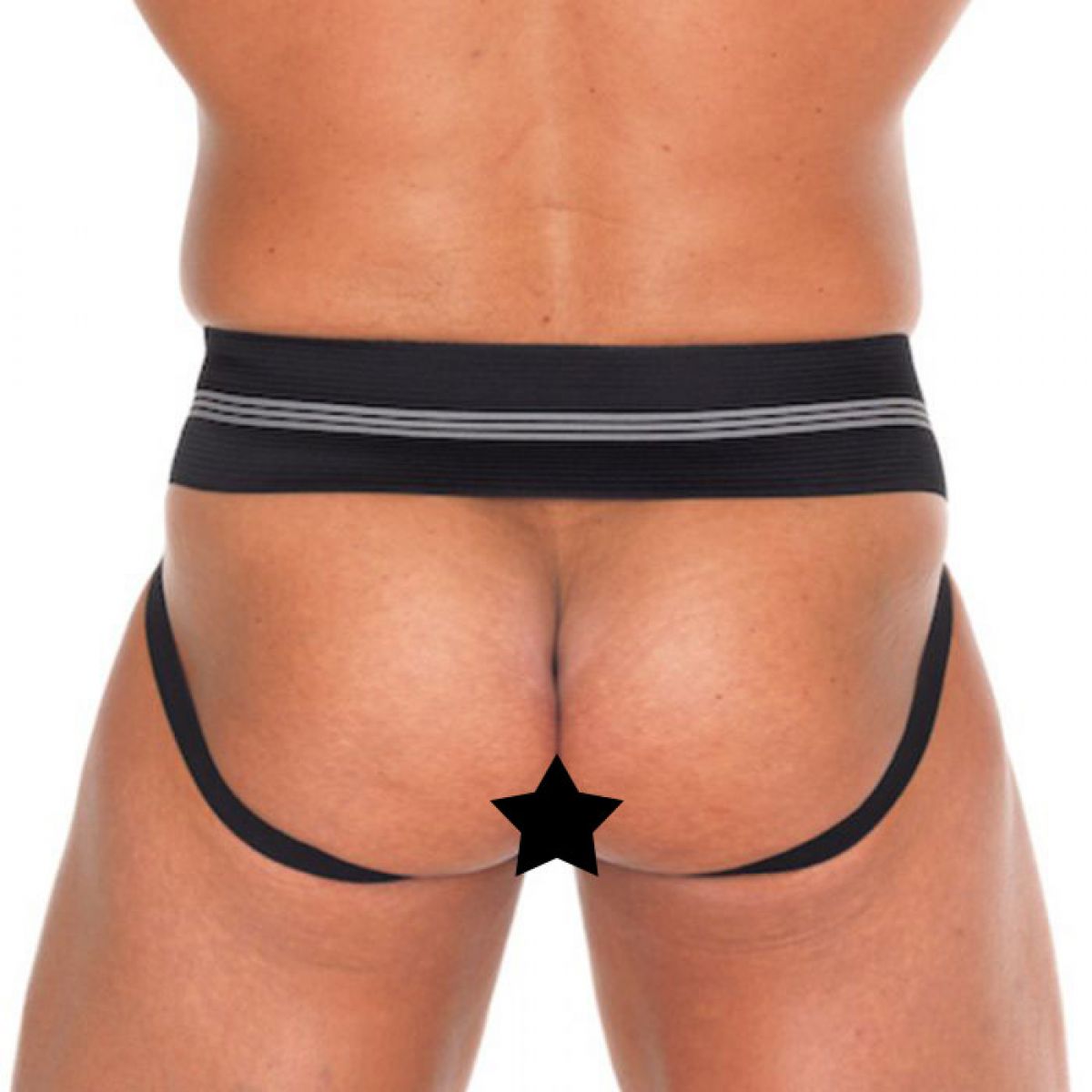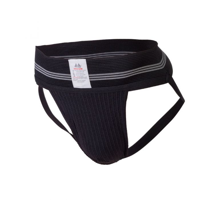 Μαύρο jockstrap με αναπνεόμενο διχτυωτό ύφασμα μπροστά. Ελαστικά στραπς και φαρδιά ζώνη 7,5 εκατοστών. 55% νάυλον, 25% ελαστάνη, 20% βαμβάκι.