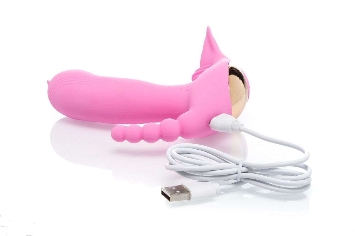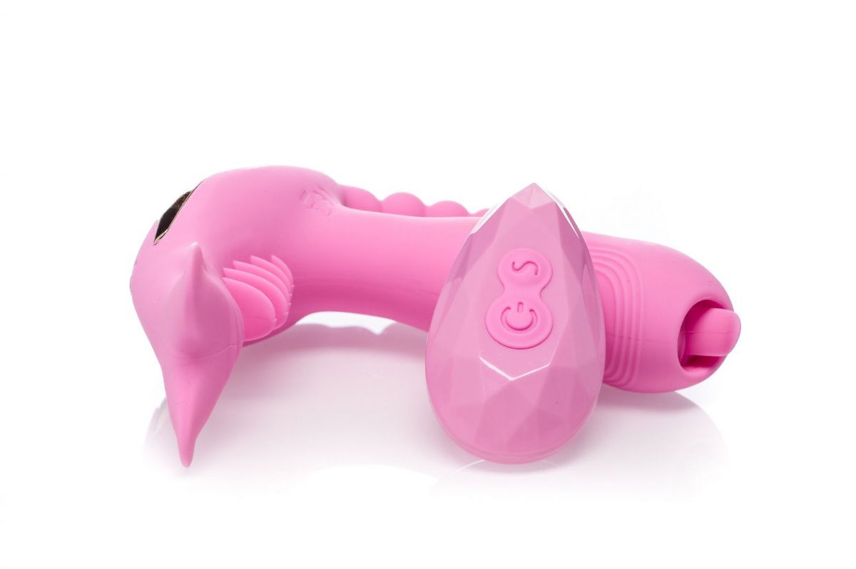 Τολμήστε στο διαφορετικό! Μοντέρνο, πρωτότυπο και άκρως απολαυστικό sex toy με 3 συναρπαστικά άκρα! Κύριο στέλεχος με παιχνιδιάρικη, τρελή γλωσσίτσα η οποία κουνιέται στο ρυθμό των 7 συναρπαστικών μοτίβων που ελέγχονται από το τηλεχειριστήριο. Κλειτοριδικό στέλεχος με ραβδωτή επιφάνεια που θα σας εκπλήξει με το ασταμάτητο παιχνίδισμά του. Μαζί με ελαστικό βολβώδες μίνι άξονα για τον πρωκτό για μια ολοκληρωμένη κορύφωση σε χρόνο ρεκόρ! Διαθέτει επαναφορτιζόμενη μπαταρία με το παρεχόμενο καλώδιο φόρτισης USB.