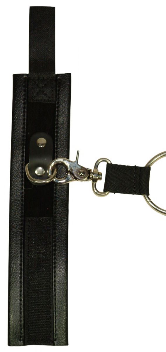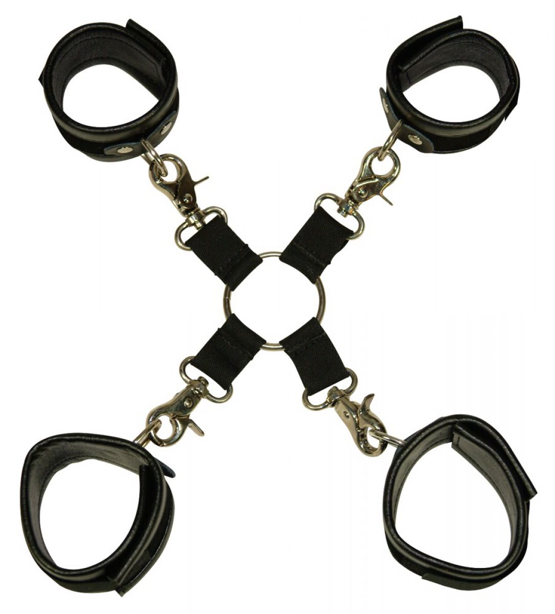 Τετραπλό δέσιμο για χέρια και πόδια που συνδέεται με έναν μεγάλο κρίκο. Όλα τα δεσίματα από δερματίνη με μαλακή επένδυση και βέλκρο κλείσιμο. Αποσπώμενα. Μέγεθος: 24 x 5 (χειροπέδες) and 30 x 5 cm (ποδοπέδες).