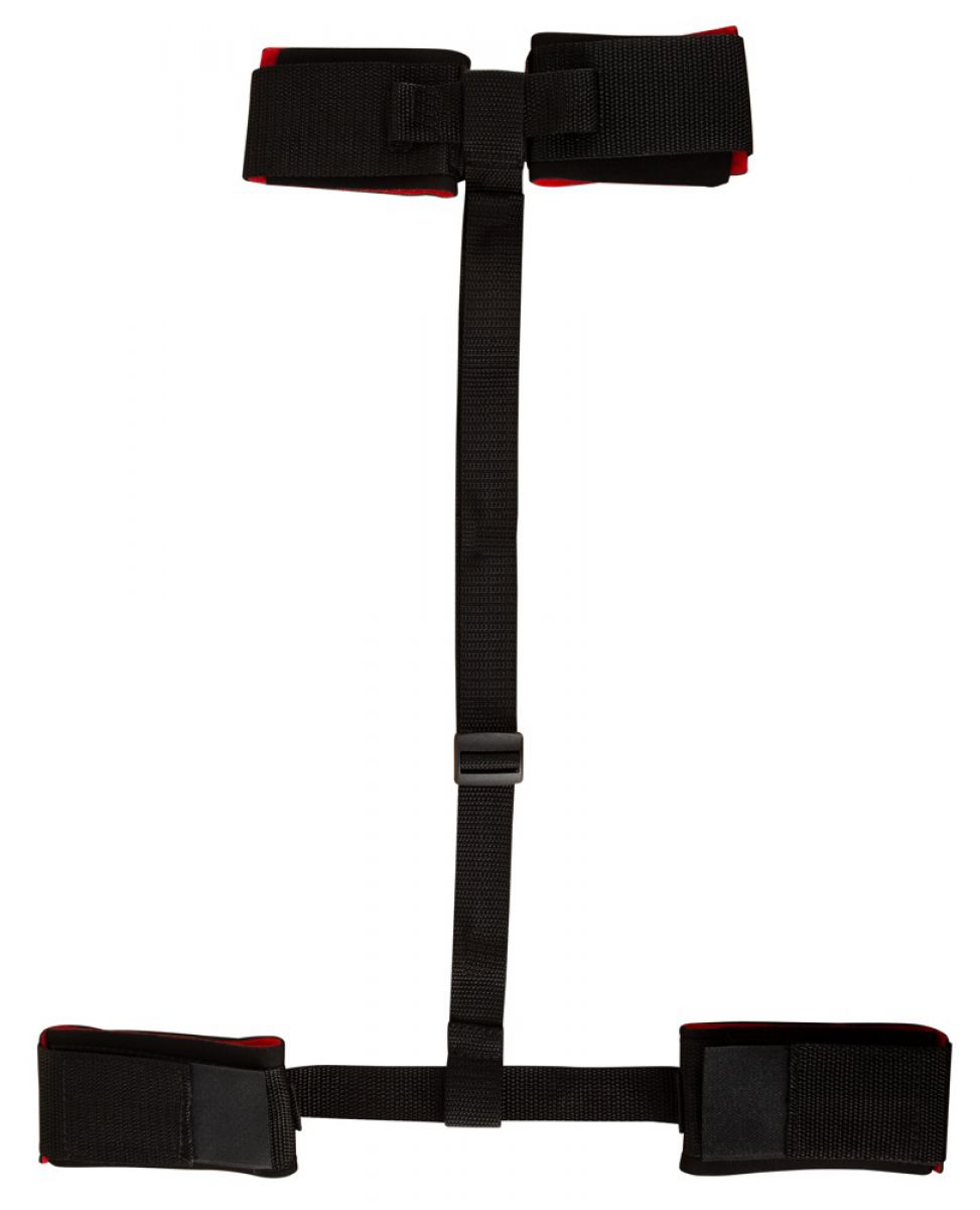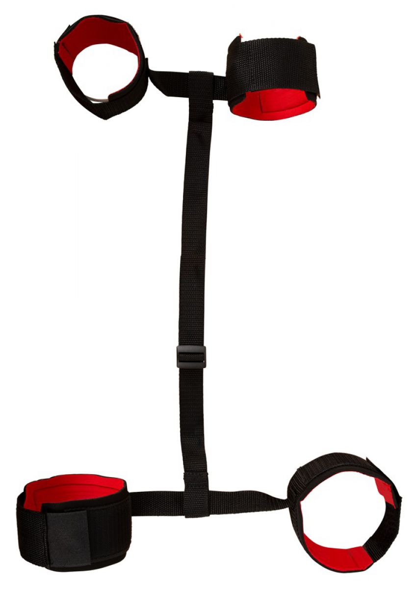 Η παράδοση δεν ήταν ποτέ τόσο σέξι! Δεσίματα για τα πόδια μαζί με κατάλληλα δεσίματα για τα χέρια ενωμένα μεταξύ τους, σε κόκκινο/μαύρο χρώμα, όλα ανεξάρτητα ρυθμιζόμενα, με μαλακό εσωτερικό και φτιαγμένα από πολύ ανθεκτικό υλικό. Απολαύστε το. Απο μαλακό υλικό που κάνει το παιχνίδι ανώδυνο. 100% Polyamid.