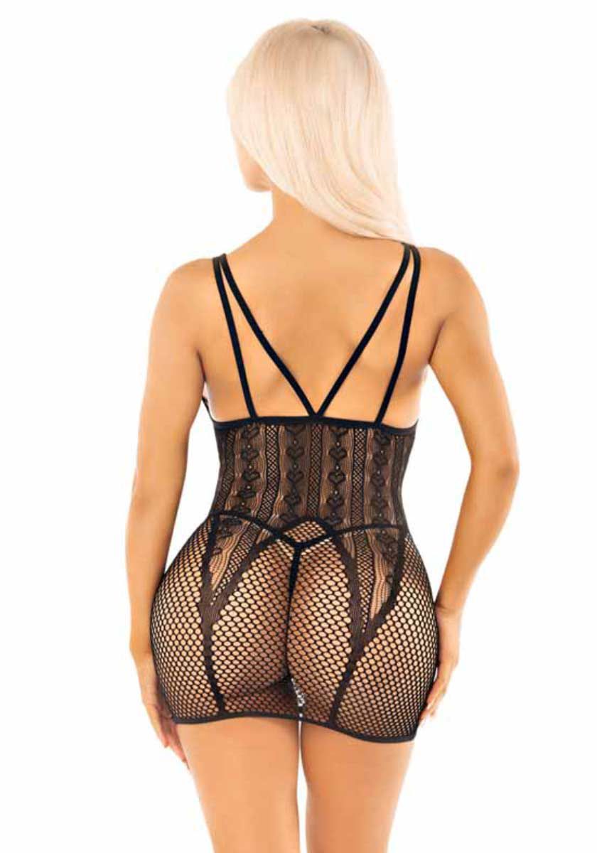 Ένα εντυπωσιακό διχτυωτό μίνι φόρεμα σε μαύρο χρώμα και περίτεχνα σχέδια που σχηματίζουν καρδιές. Το φόρεμα διαθέτει λεπτές τιράντες που δημιουργούν ένα αισθησιακό και κομψό look. Το σχέδιο συνδυάζει μικρά πλέγματα με κάθετες γραμμές, τονίζοντας τις καμπύλες του σώματος με σέξι αλλά και κομψό τρόπο. Το στρίνγκ δεν περιλαμβάνεται στην συσκευασία. 94% νάυλον, 6% ελαστάνη